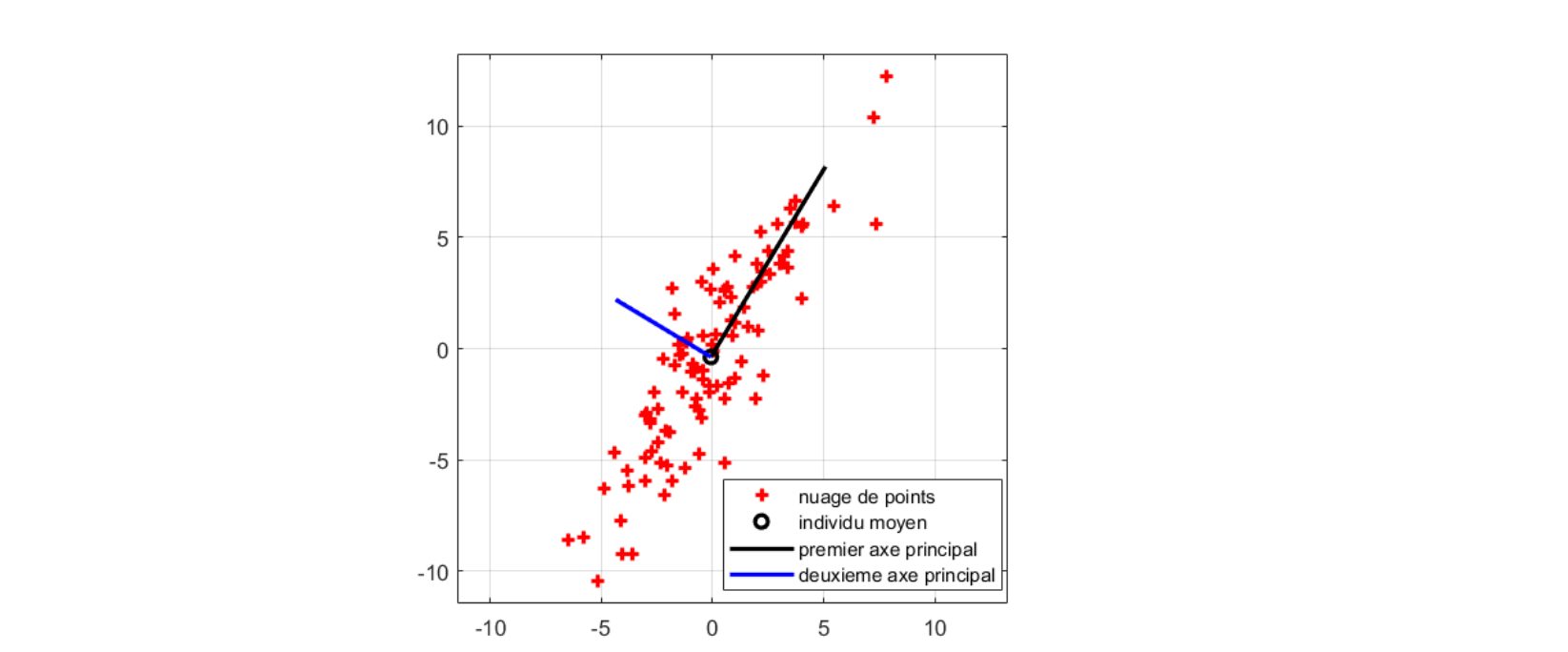Dans ce nouveau repère, l’origine correspond à l’individu moyen (i.e. la moyenne des individus). En projetant l’ensemble des individus sur le premier axe de la nouvelle base, on obtient la meilleure approximation du tableau des données dans un espace à une dimension. En projetant les individus sur le plan créé par les deux premiers axes –le second étant orthogonal au premier–, on obtient la meilleure approximation de l’ensemble des données dans un espace à deux dimensions, etc. Les nouveaux axes sont décorrélés deux à deux.