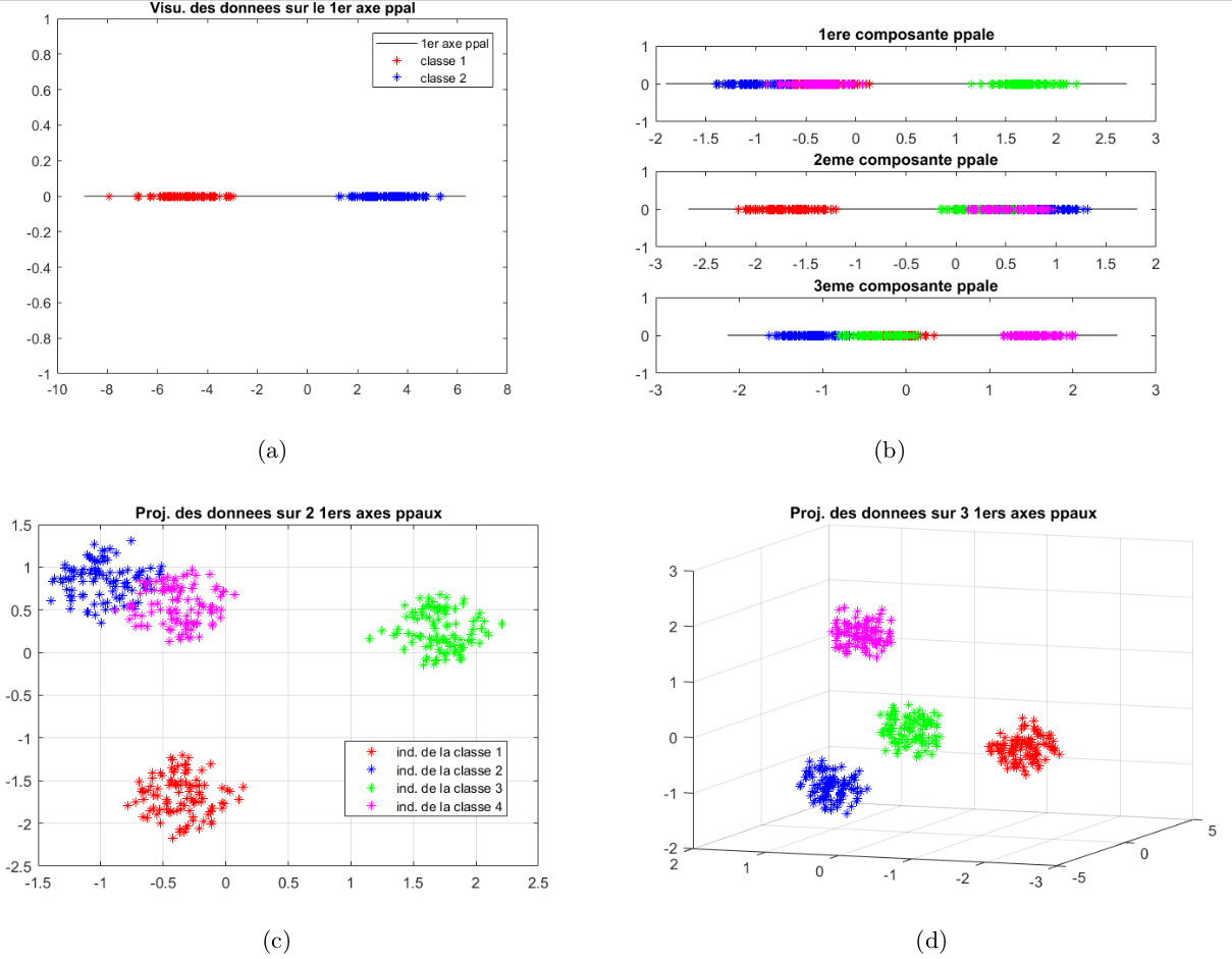 Figure 2 – (a) : composante principale d’un nuage de points contenant deux classes : cette première composante suffit à mettre en évidence les deux classes. Les images (b), (c), (d) représentent un même nuage de points de $\mathbb{R}^{30}$ – contenant quatre classes – dans trois configurations différentes : (b) : première, deuxième et troisième composantes principales du nuage. (c) : le nuage dans le repère défini par les deux premiers axes principaux. (c) : le nuage dans le repère défini par les trois premiers axes principaux.